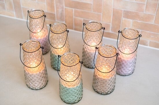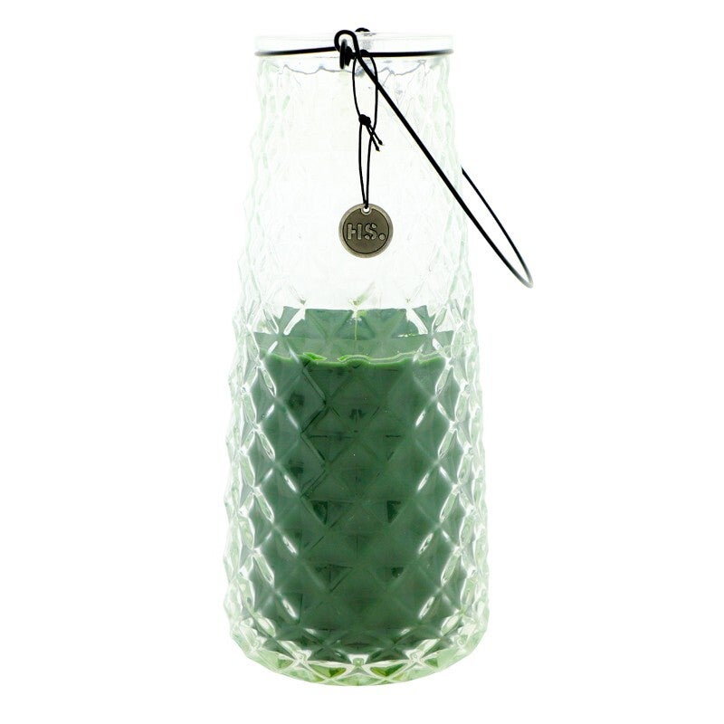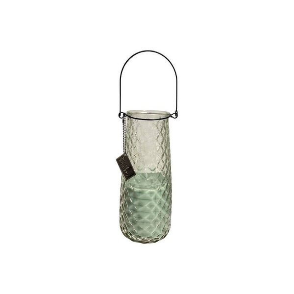 Kaars van Home Society in een mooi glas met ijzeren hengsel die je buiten of binnen kunt ophangen of neer zetten.